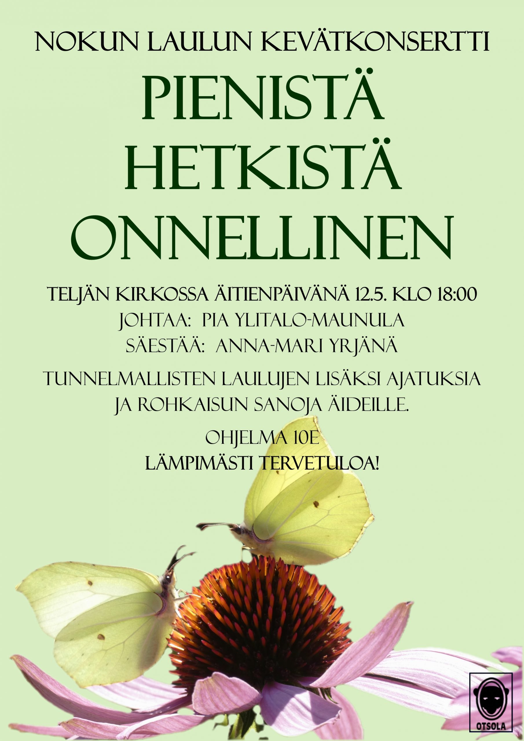7.4.20247.4.2024 admin Nokun laulu esiintyy tänä keväänä kahdessa kevätkonsertissa Teljän ja Noormarkun kirkoissa.Tervetuloa kuuntelemaan.